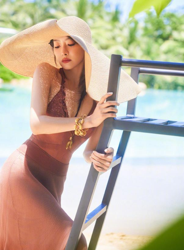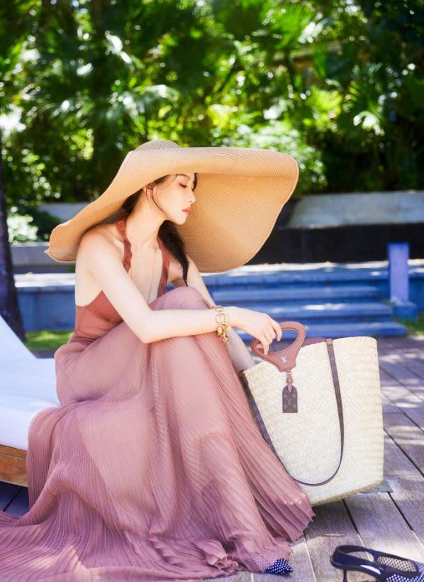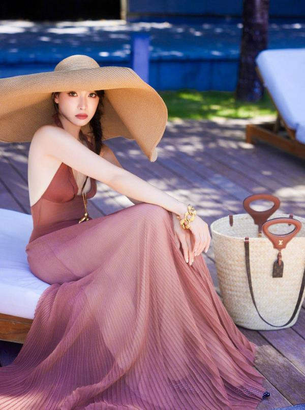 宋茜身着一袭粉色露背百褶长裙,轻盈飘逸。搭配一顶宽檐遮阳帽,简约大气。整体穿搭尽显优雅时尚,完美衬托出她的曼妙身姿与独特气质,令人眼前一亮。